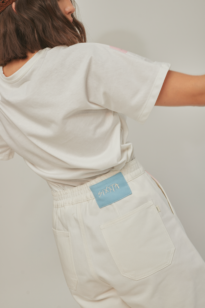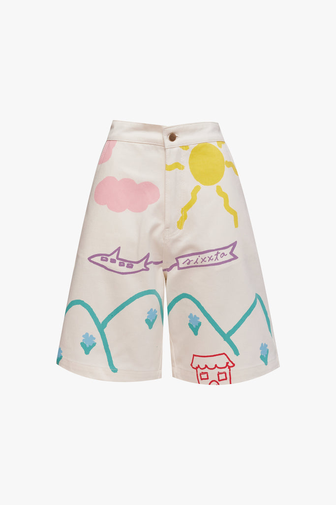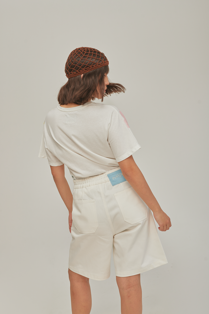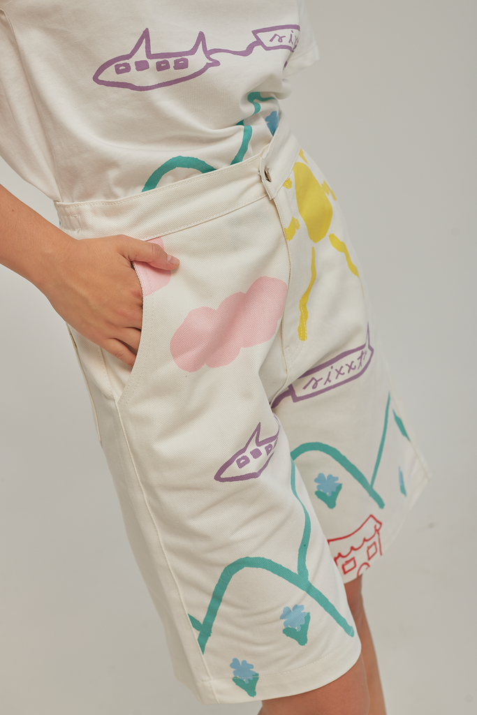 For this collection, we bring back our classic Bermuda shorts with a straight silhouette and an elastic back that makes them extra comfortable. This time, we’ve reinvented them with our colorful strokes print, inspired by those fun childhood parks where we found Good Luck and used to draw the landscapes we imagined on sheets of paper.