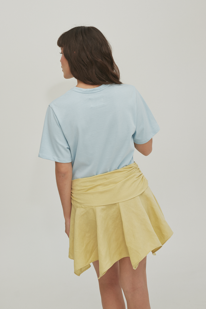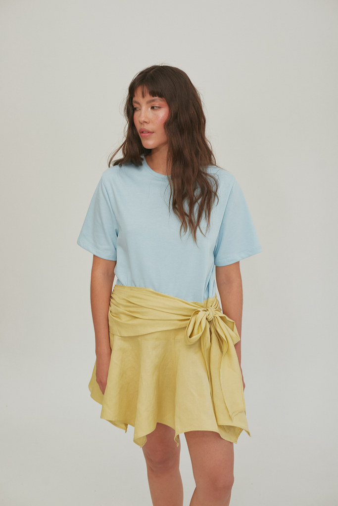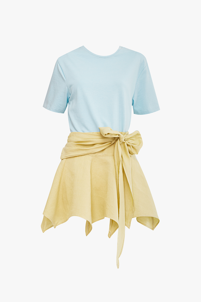 Our Montain Dress is the perfect expression of freshness with its loose and lightweight silhouette. The top is made from an oversized t-shirt, while the skirt offers plenty of movement and asymmetric shapes. It features a side bow that adds a romantic and special touch, making it a must-have for your wardrobe.