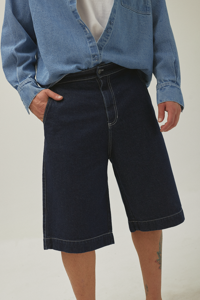 We welcome our new Dark Blue Bermuda Shorts for men. It keeps our retro silhouette but now comes in a wider and longer fit. Made from 100% cotton rigid denim, they're as comfortable as they are durable, ensuring they'll last forever and look so cool you won't want to take them off.