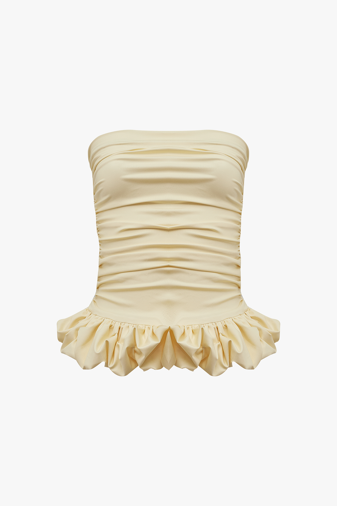 Our Panettone Top, now in Midi! This piece combines draping that flows along your entire silhouette with a puffy ruffle detail at the bottom, giving a perfect dreamy and elegant touch to all your looks.