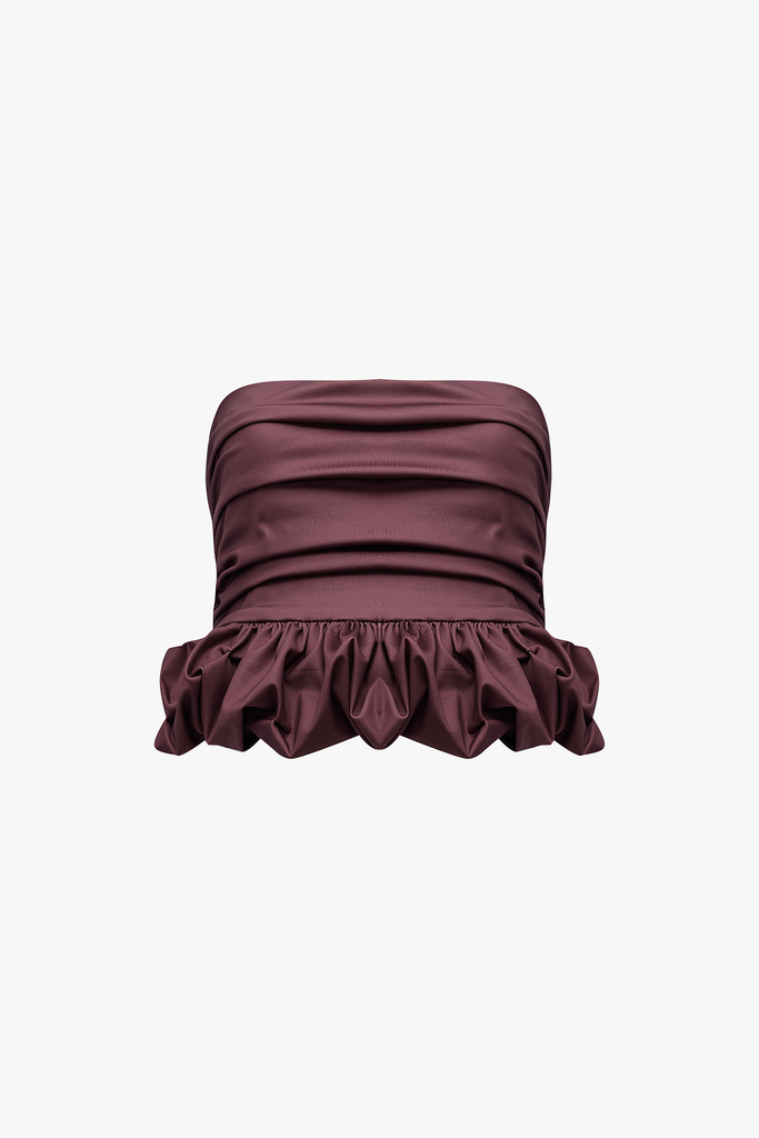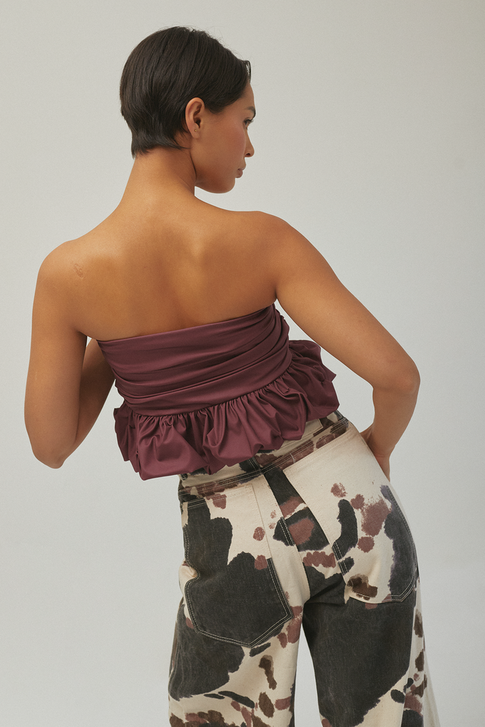 Our new panettone top is a celebration! This top combines beautiful draping with a puffy ruffle detail at the bottom that perfectly shapes your silhouette, creating the dream strapless look. It’s perfect for elevating and complementing all your outfits.