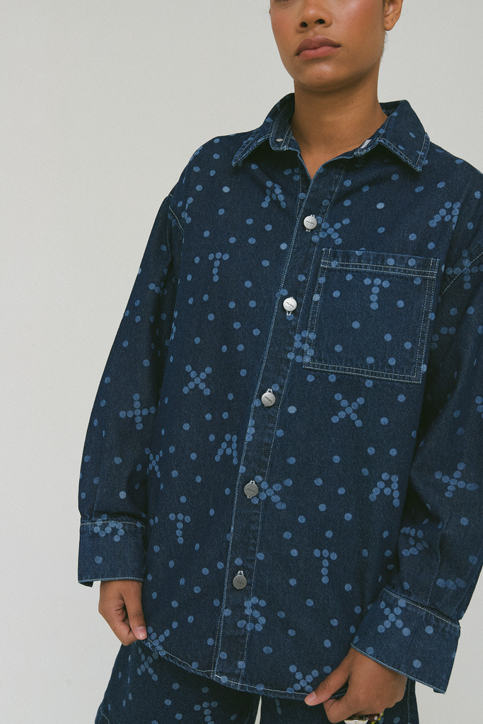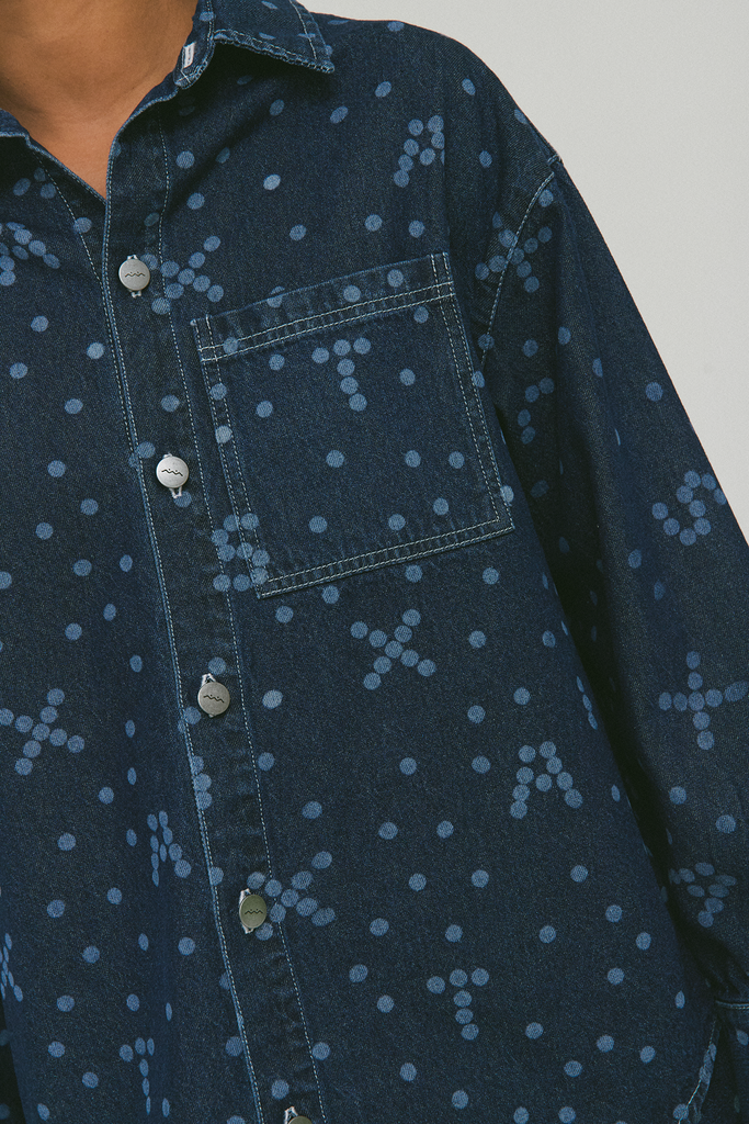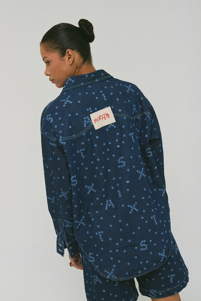 With an oversized silhouette and long sleeves, this piece keeps you looking fresh and feeling comfortable. It features a front pocket and our signature paired fabric-covered buttons. On the back, you'll find our iconic Wiggly cut—now paired with the new Sixxta rivet detail.